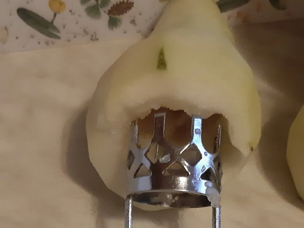 Очистите груши от кожуры, отрежьте нижнюю часть и удалите сердцевину.