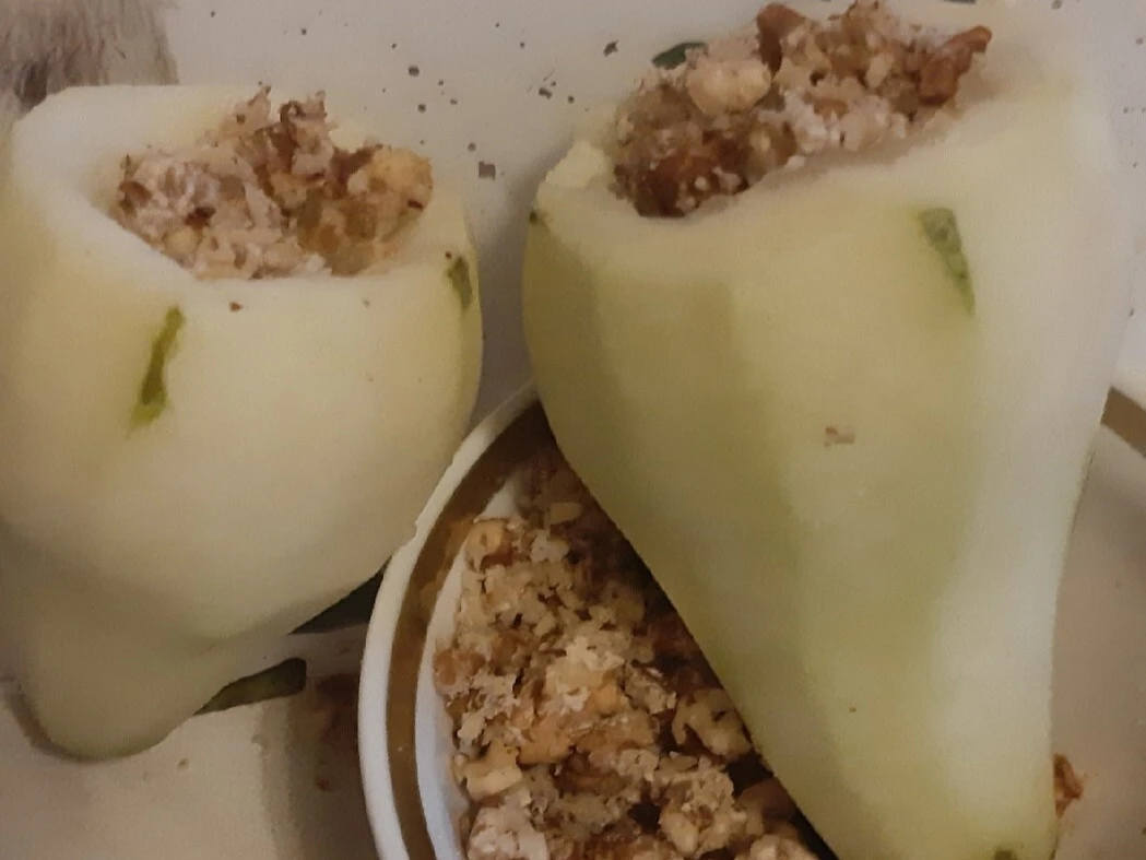 Измельчите орехи, добавьте мёд и перемешайте. Начините получившейся смесью груши.
