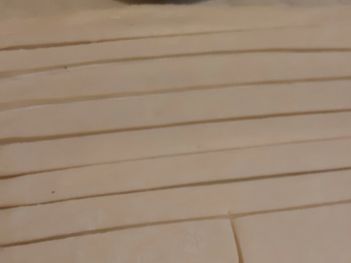 Нарежьте тесто на длинные полоски и оберните ими груши.