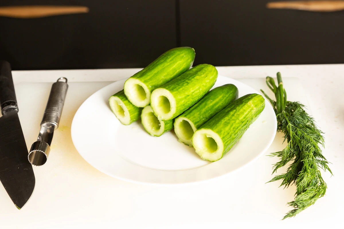 Огурцы разрежьте поперёк на две части и выньте мякоть.