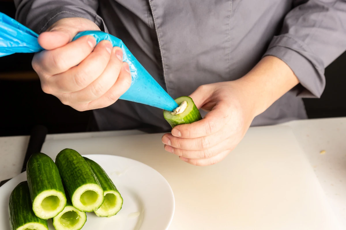 Переложите массу в кондитерский мешок и начините ею половинки огурцов.