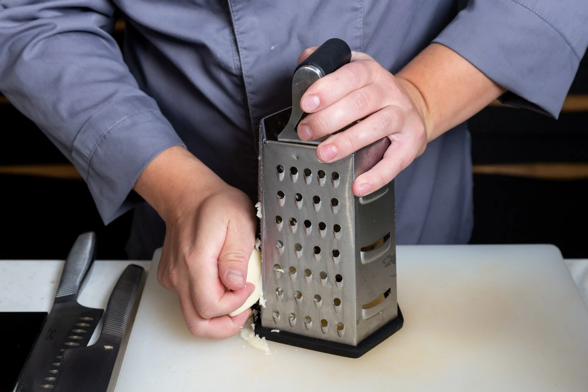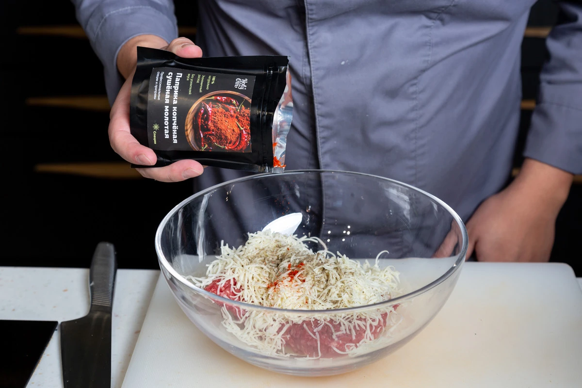 Положите говяжий фарш в миску, добавьте тёртый сыр, паприку, чёрный молотый перец.