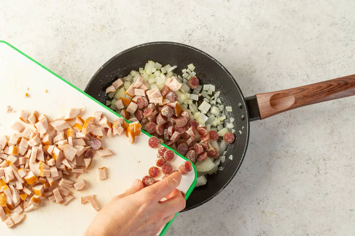 В рецепте используются товары из категорий: Колбаса, сосиски, деликатесы; Масла, соусы, специи, сахар и соль; Овощи, фрукты, ягоды, зелень