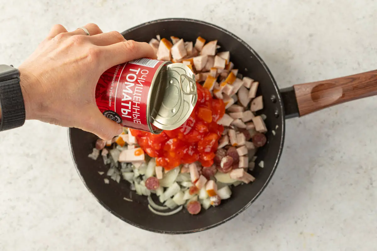 Смешайте колбаски с луком и резаными томатами из банки.