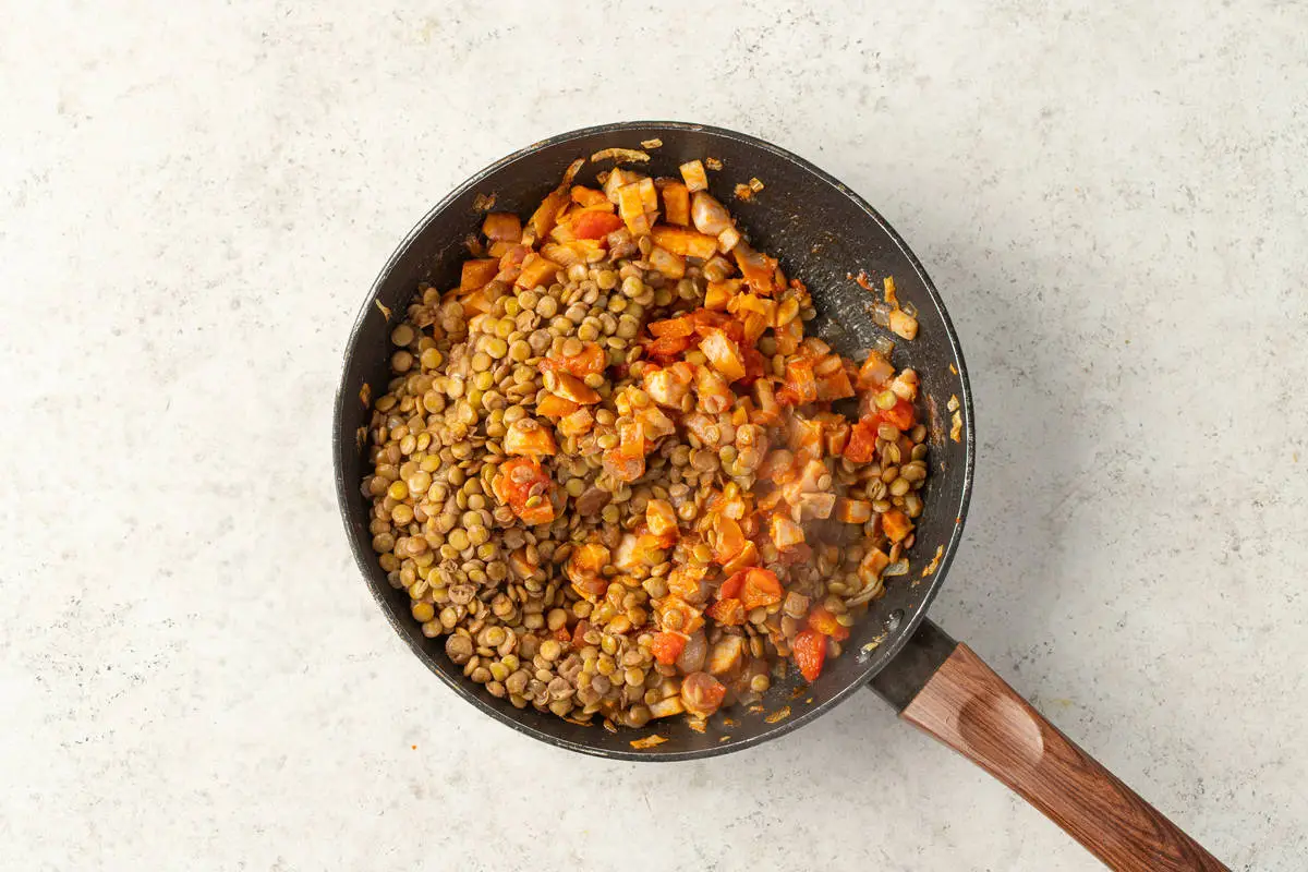 Добавьте чечевицу, паприку, посолите и перемешайте.