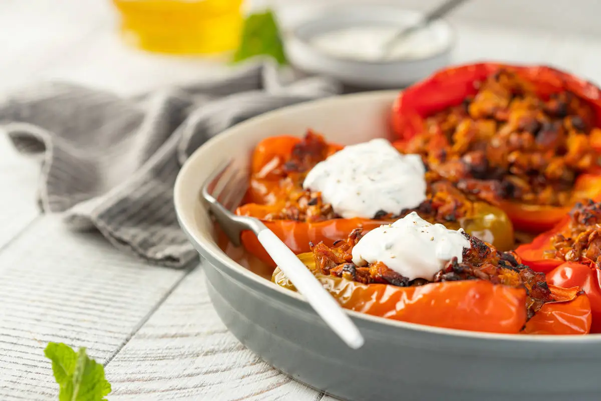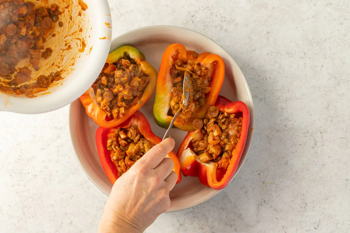 Фаршированные перцы «Лодочки» с колбасками и чечевицей
