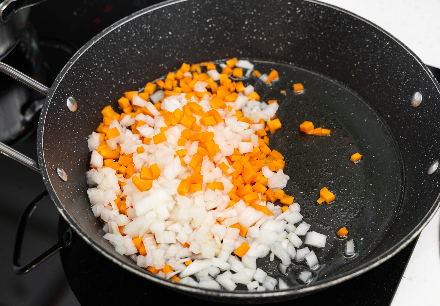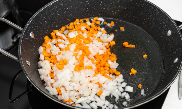 Репчатый лук и морковь нарежьте мелким кубиком и обжарьте на сковороде до мягкости.