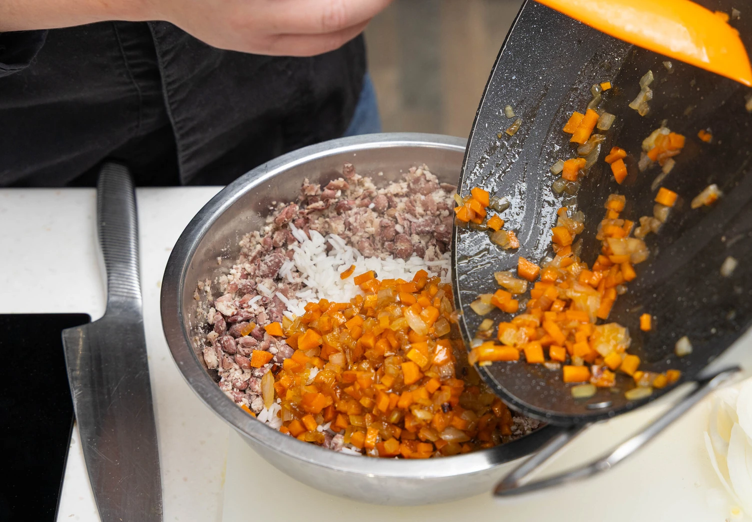 Смешайте в глубокой миске отварную фасоль, половину обжаренных овощей, рис и добавьте специи по вкусу — получится фарш для начинки.
