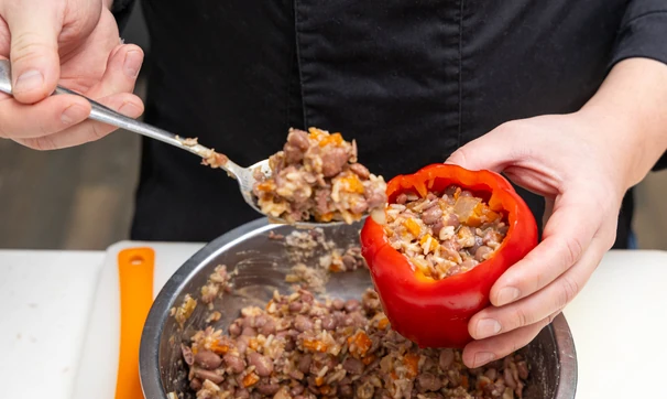 Советуем использовать для этого блюда именно сухую красную фасоль: в ней гораздо больше белка, чем в консервированной. Фаршированные перцы получатся максимально полезными, вкусными и питательными.