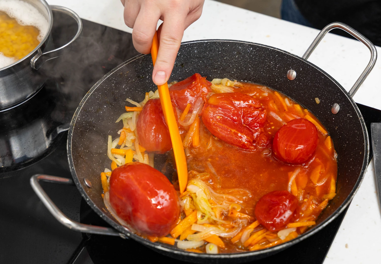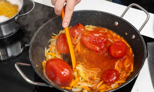 Для соуса оставшиеся лук и морковь залейте томатной смесью из банки и тушите на среднем огне 10 минут, периодически помешивая.
