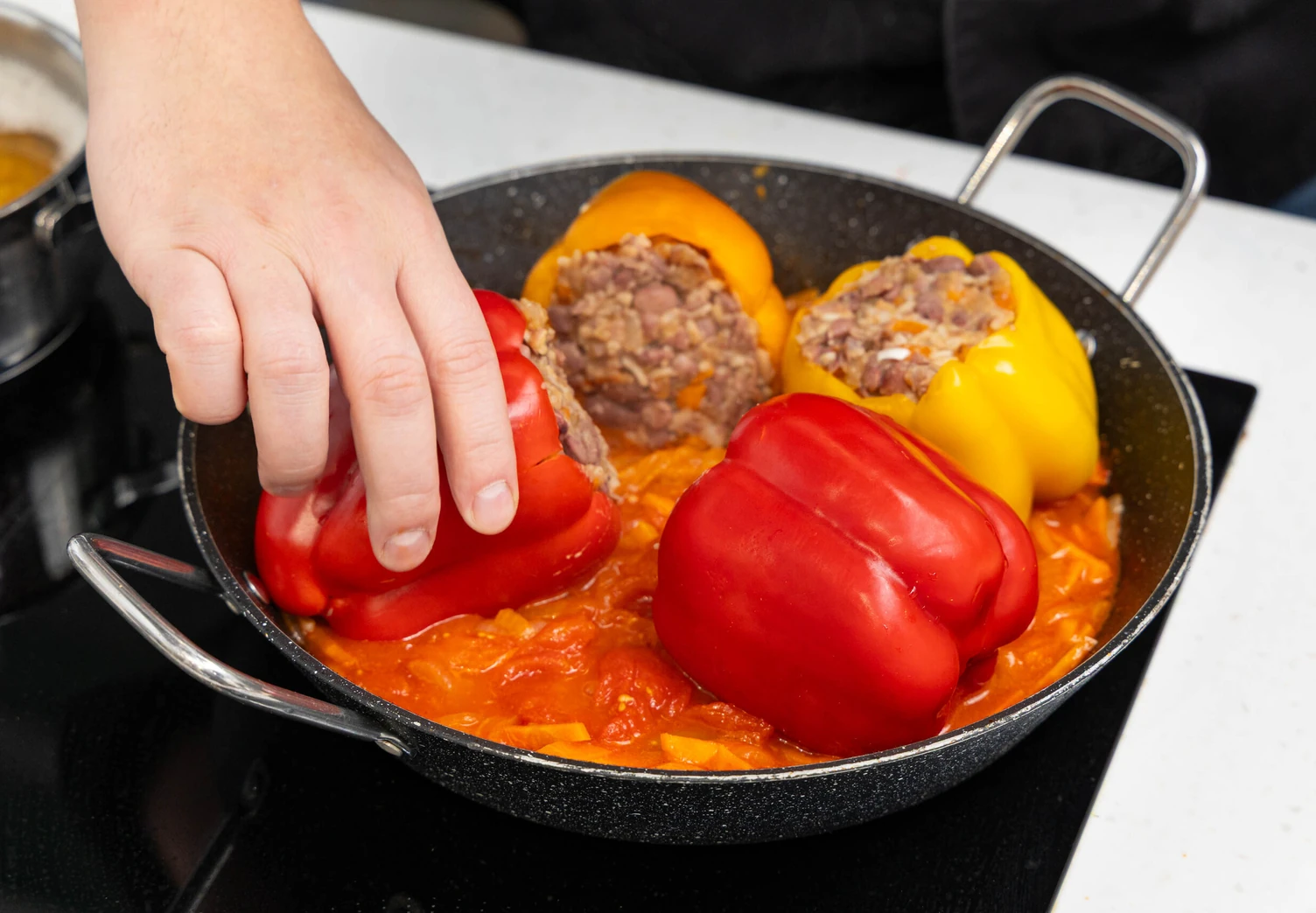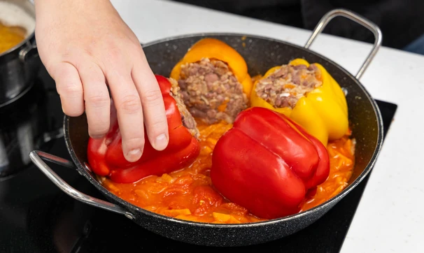 Выложите фаршированные перцы в соус, накройте крышкой и тушите на медленном огне 20 минут.