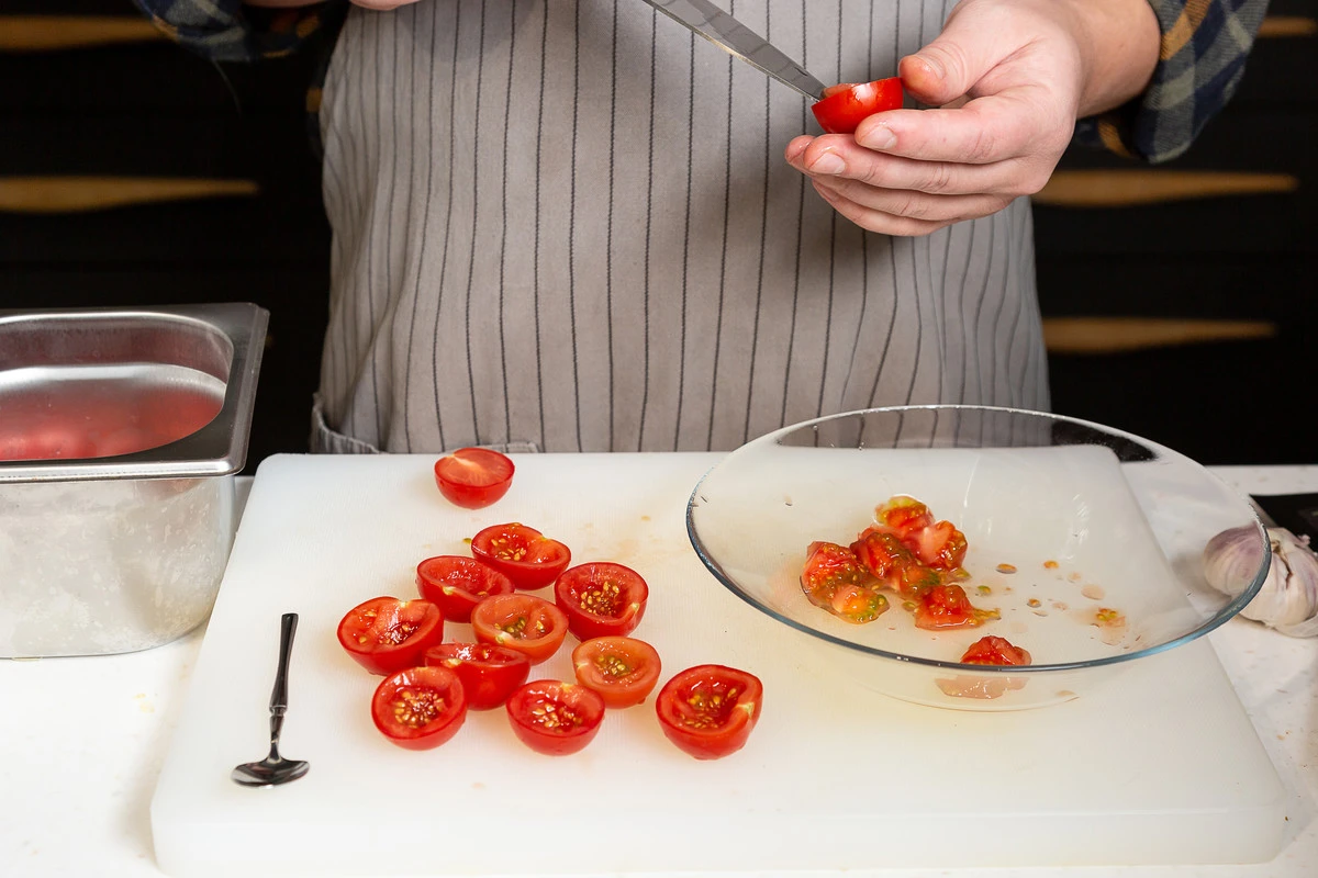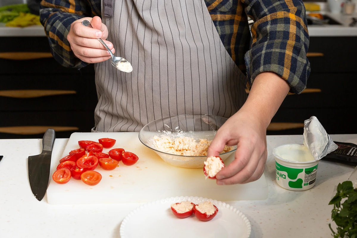 10 помидорок черри разрежьте пополам. Аккуратно, стараясь не повредить стенки, достаньте ложкой мякоть.