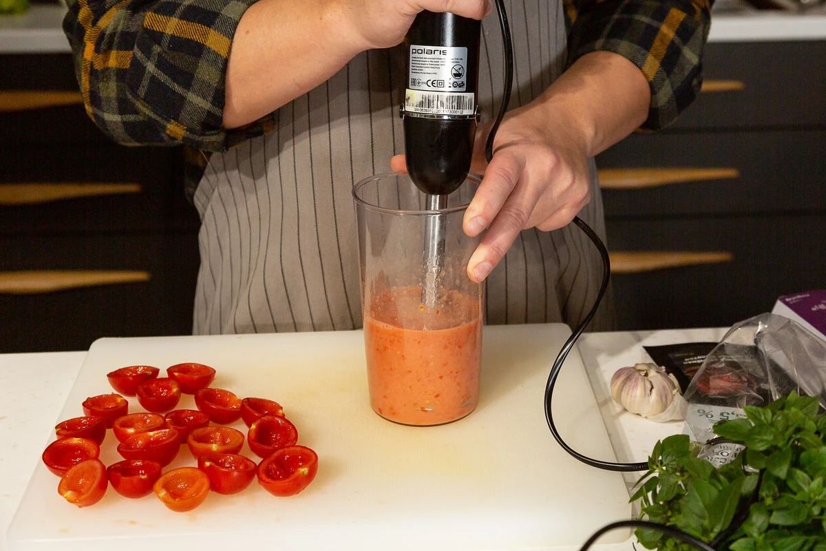 Положите мякоть в стакан блендера, добавьте еще 8 черри (можно разрезать пополам) и измельчите до однородности.