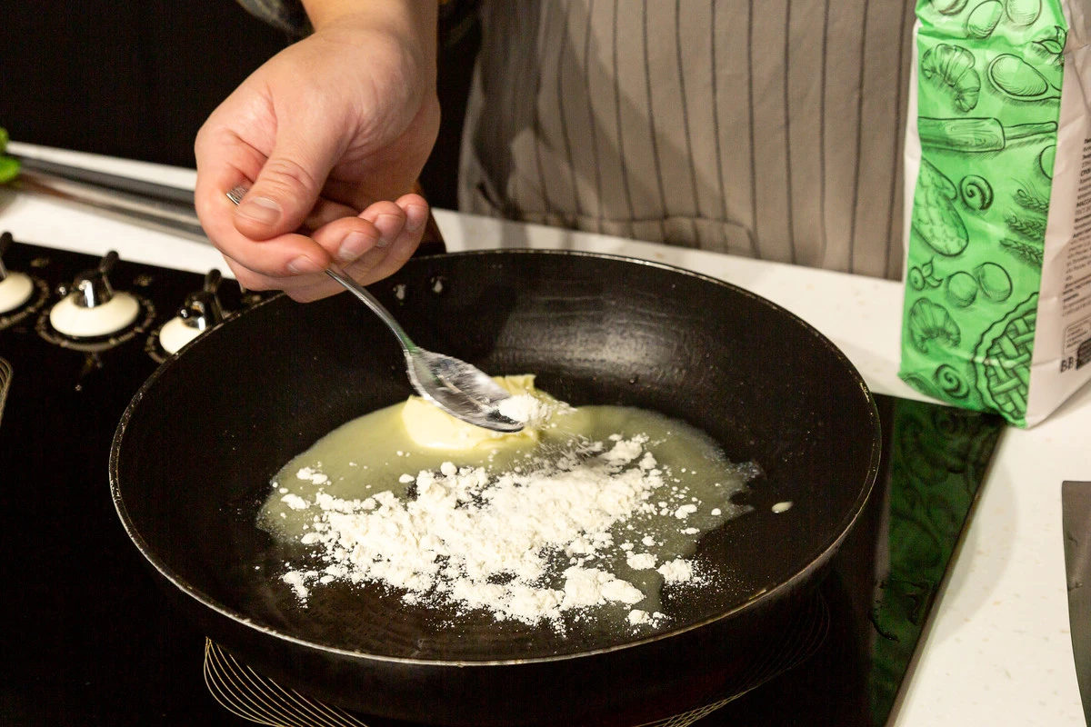 Растопите в сковороде сливочное масло, добавьте муку. Перемешайте, чтобы не было комочков. Слегка обжарьте.