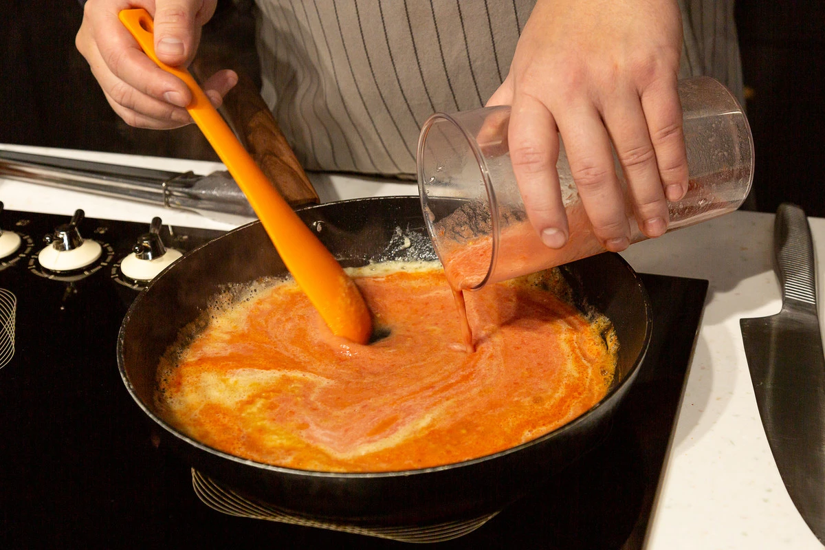 Вылейте туда же измельчённую мякоть томатов, добавьте рубленый базилик. Перемешайте и прогрейте всё вместе. При необходимости немного выпарите жидкость. Должен получиться в меру густой соус.