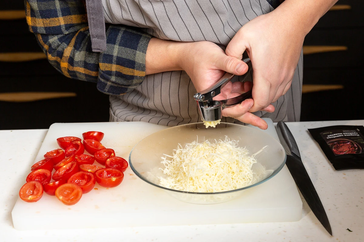 Сыр натрите на мелкой тёрке и выложите в миску. Чеснок пропустите через пресс и добавьте к сыру.