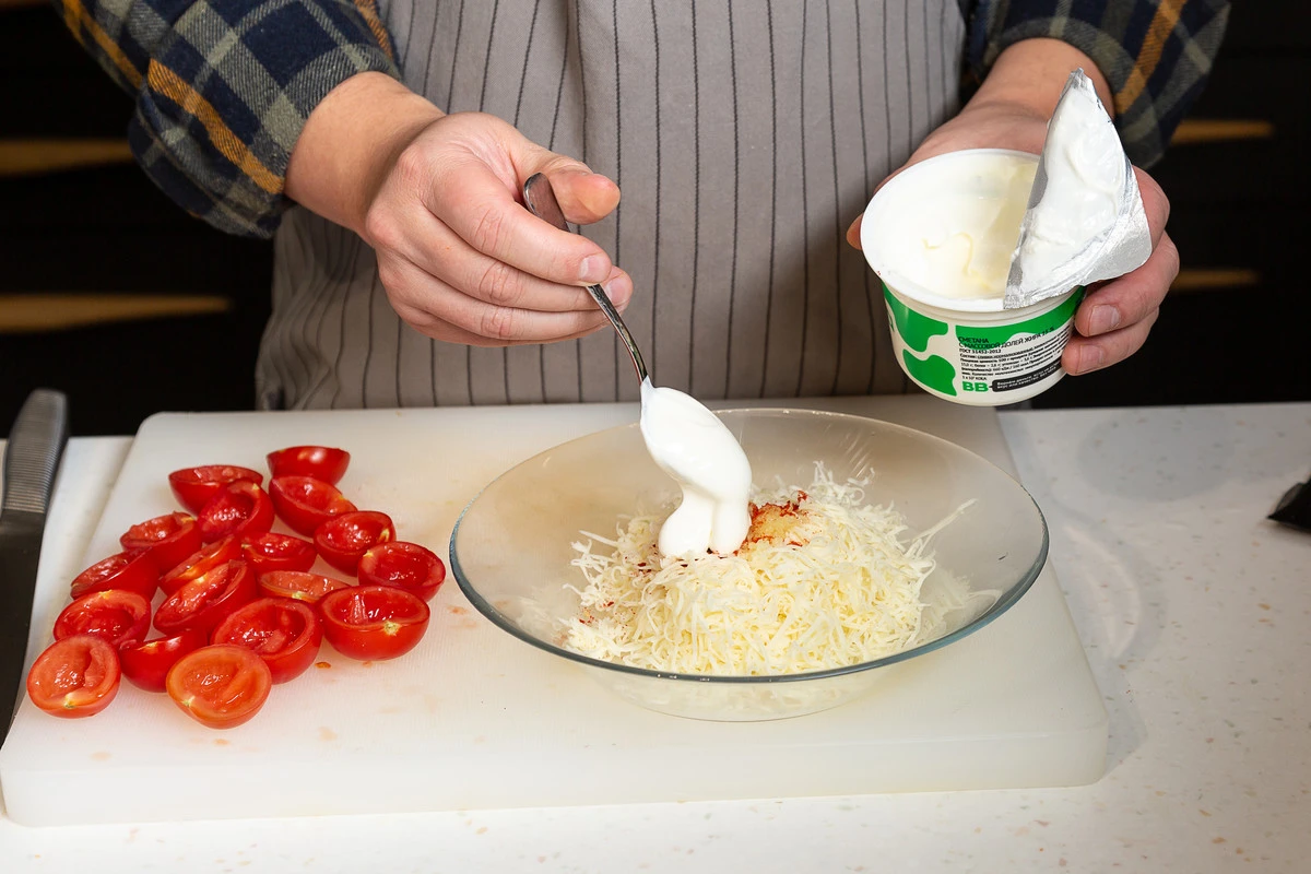 Насыпьте копчёную паприку, положите сметану и перемешайте до соединения компонентов.
