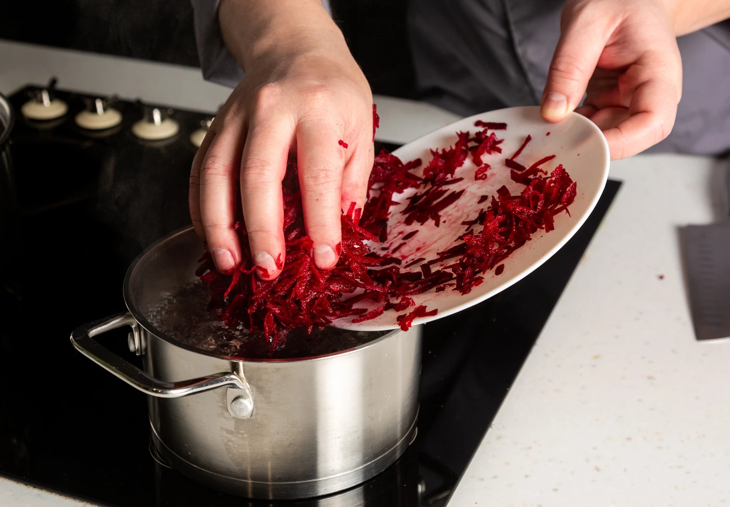 Выложите свёклу в кастрюлю, добавьте уксус и воду и поставьте на средний огонь. Варите 20 минут после закипания под крышкой.