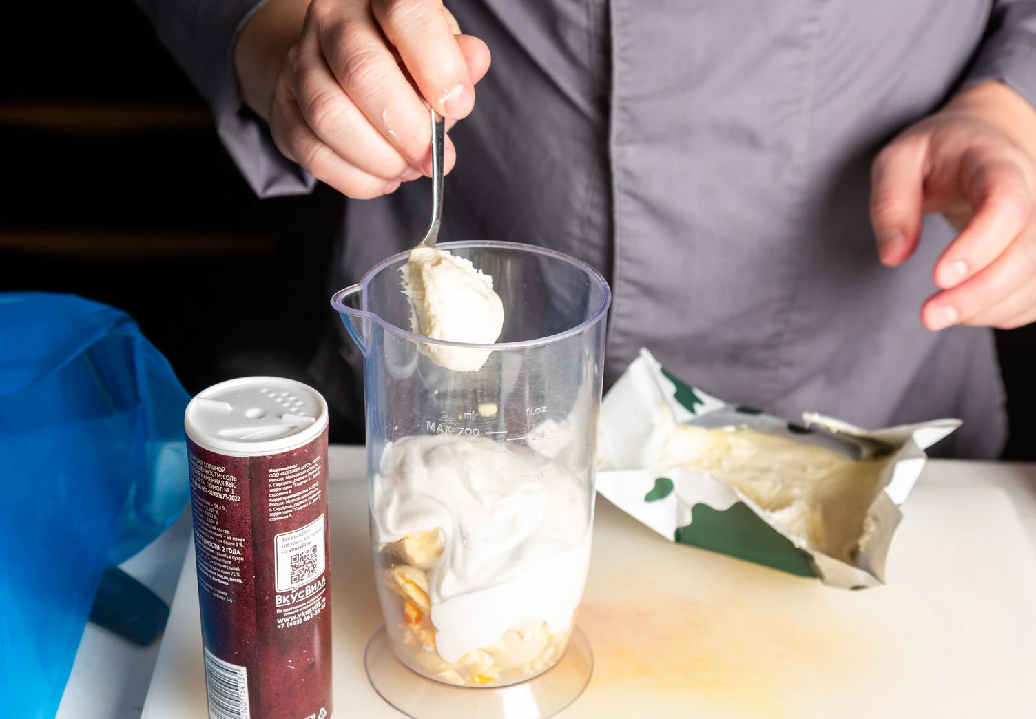 Отделите желтки от белков и смешайте со сметаной, солью, чёрным перцем и сливочным маслом.
