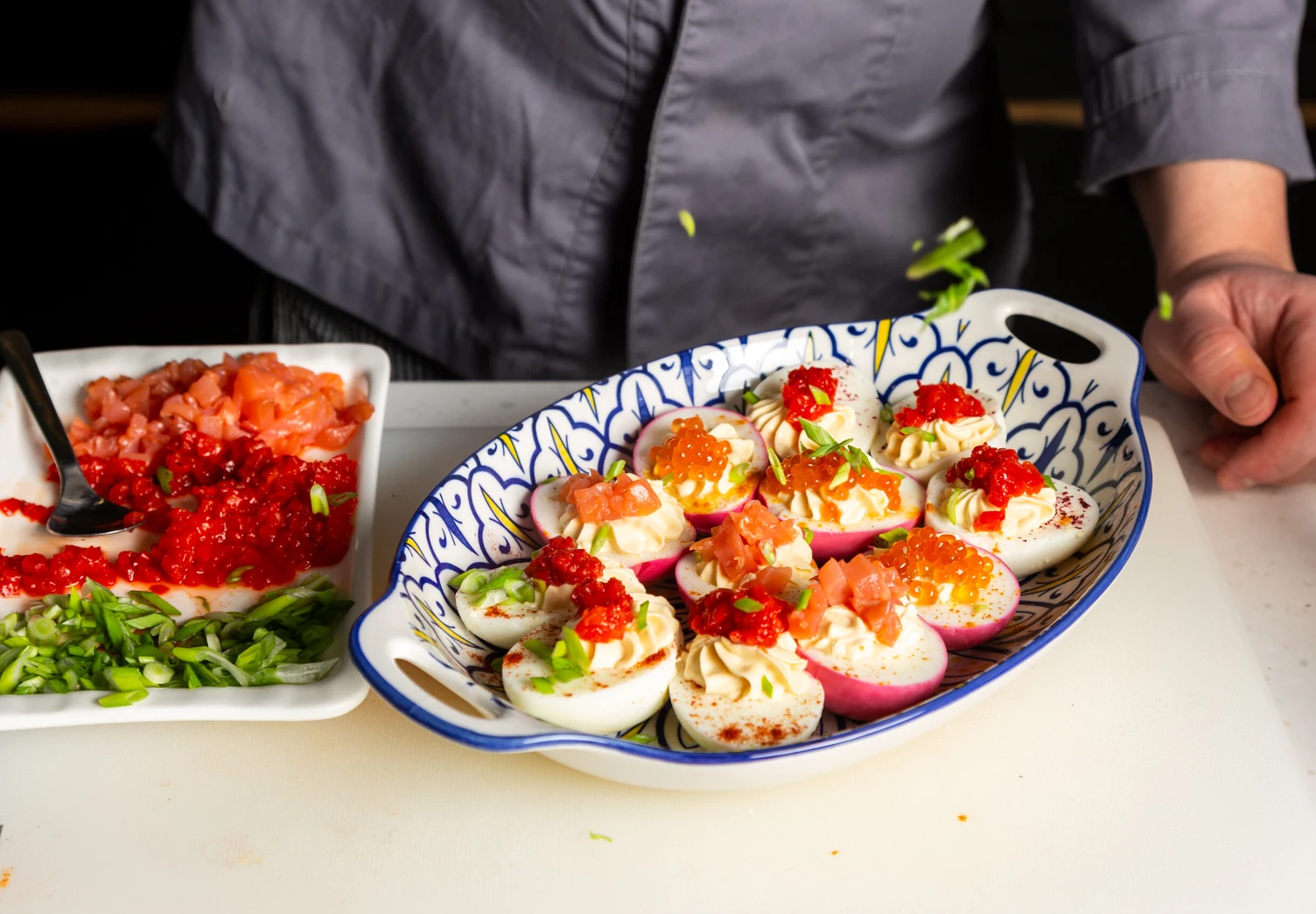 Дополните каждое яйцо икрой, форелью, печёным перцем и рубленым зелёным луком.