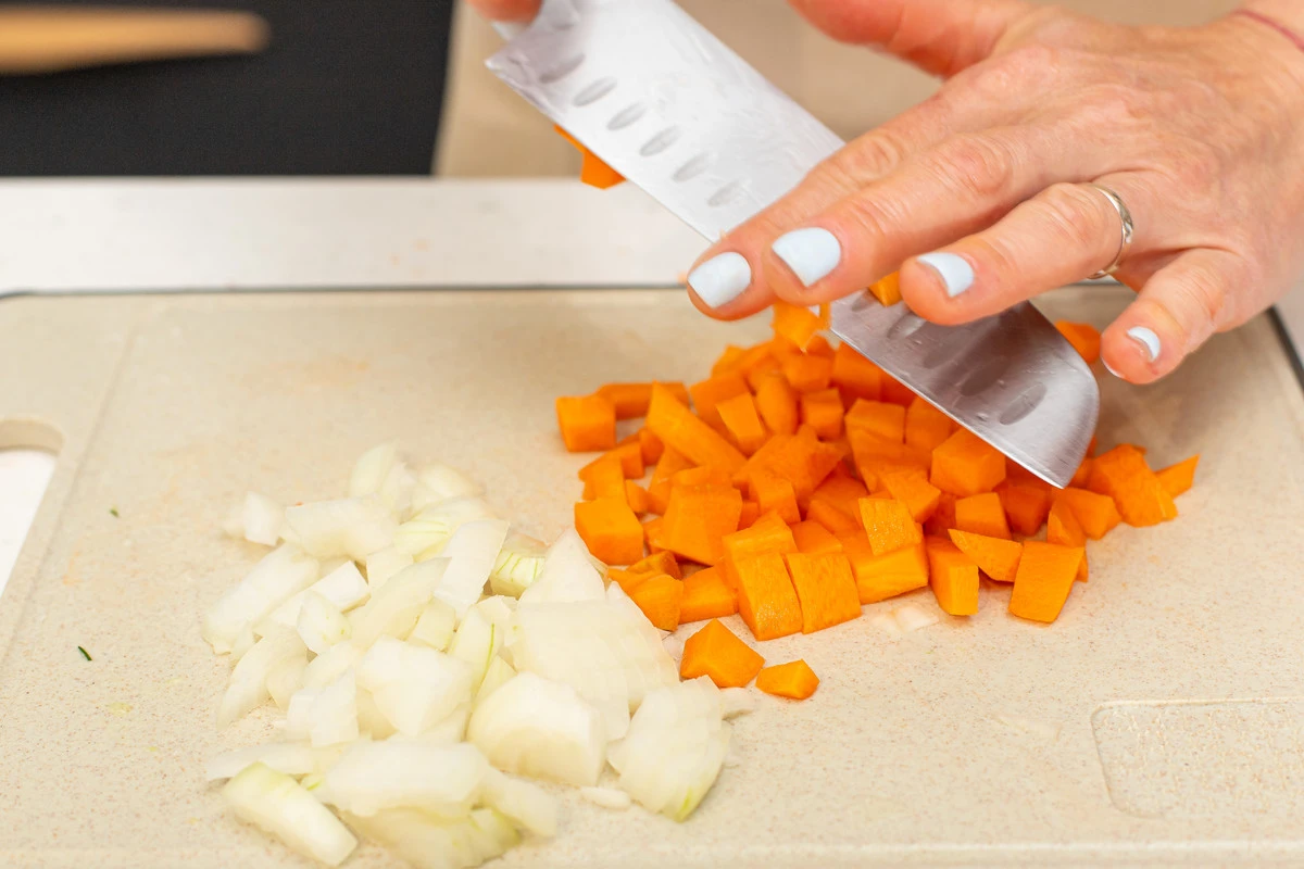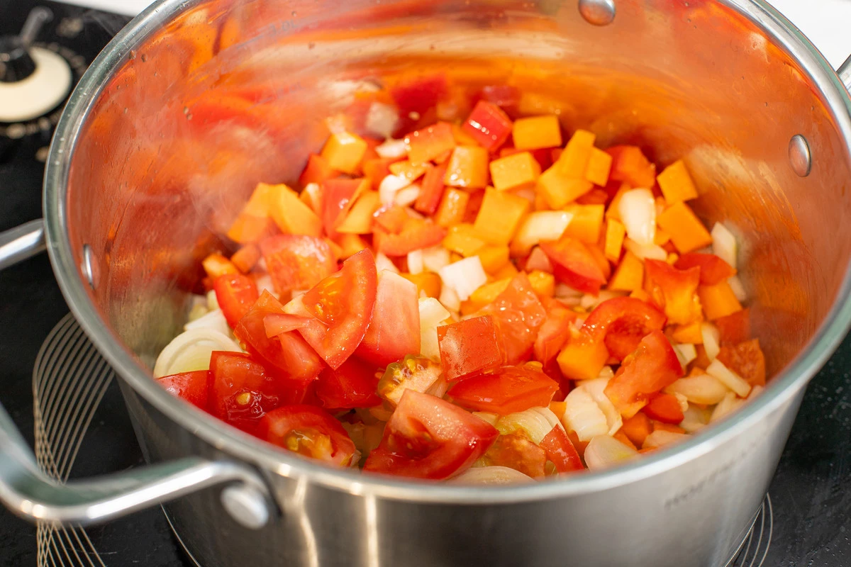 Одну луковицу и обе моркови очистите и нарежьте кубиками. Сладкий перец и томаты также нарежьте кубиками.