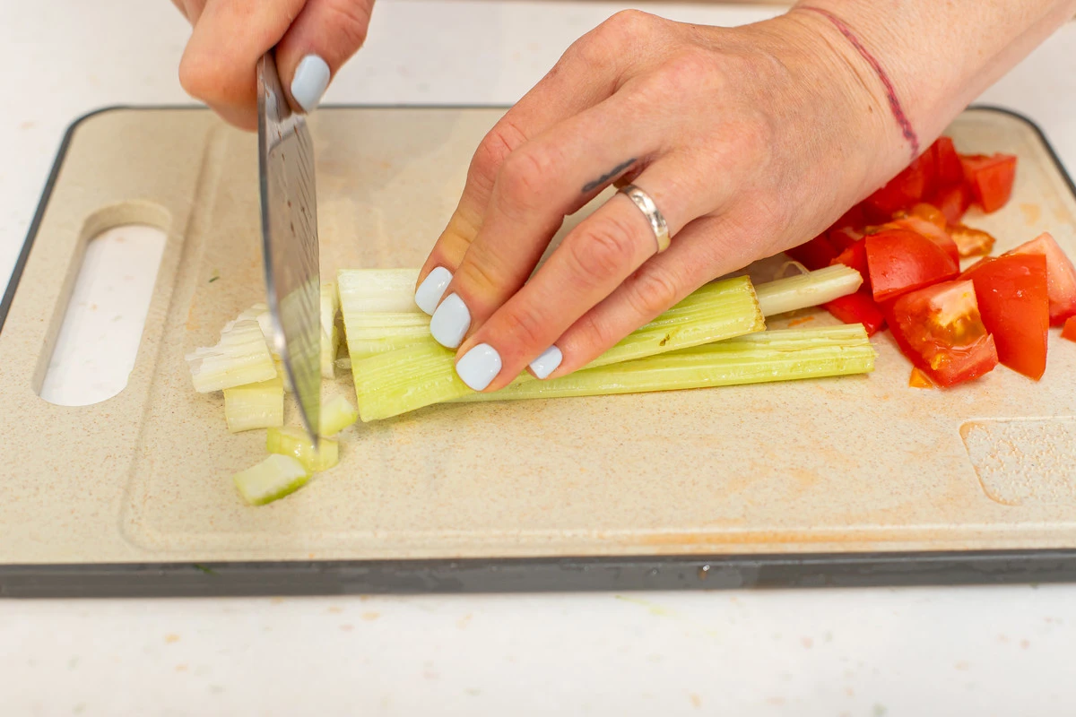 Лук-порей нарежьте кольцами, стебли сельдерея — кубиками. Добавьте к остальным овощам, посолите, всыпьте специи и жарьте ещё минуту.