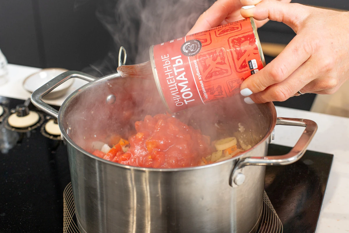 Добавьте в кастрюлю содержимое банки консервированных томатов и фасоль вместе с жидкостью, влейте воду.