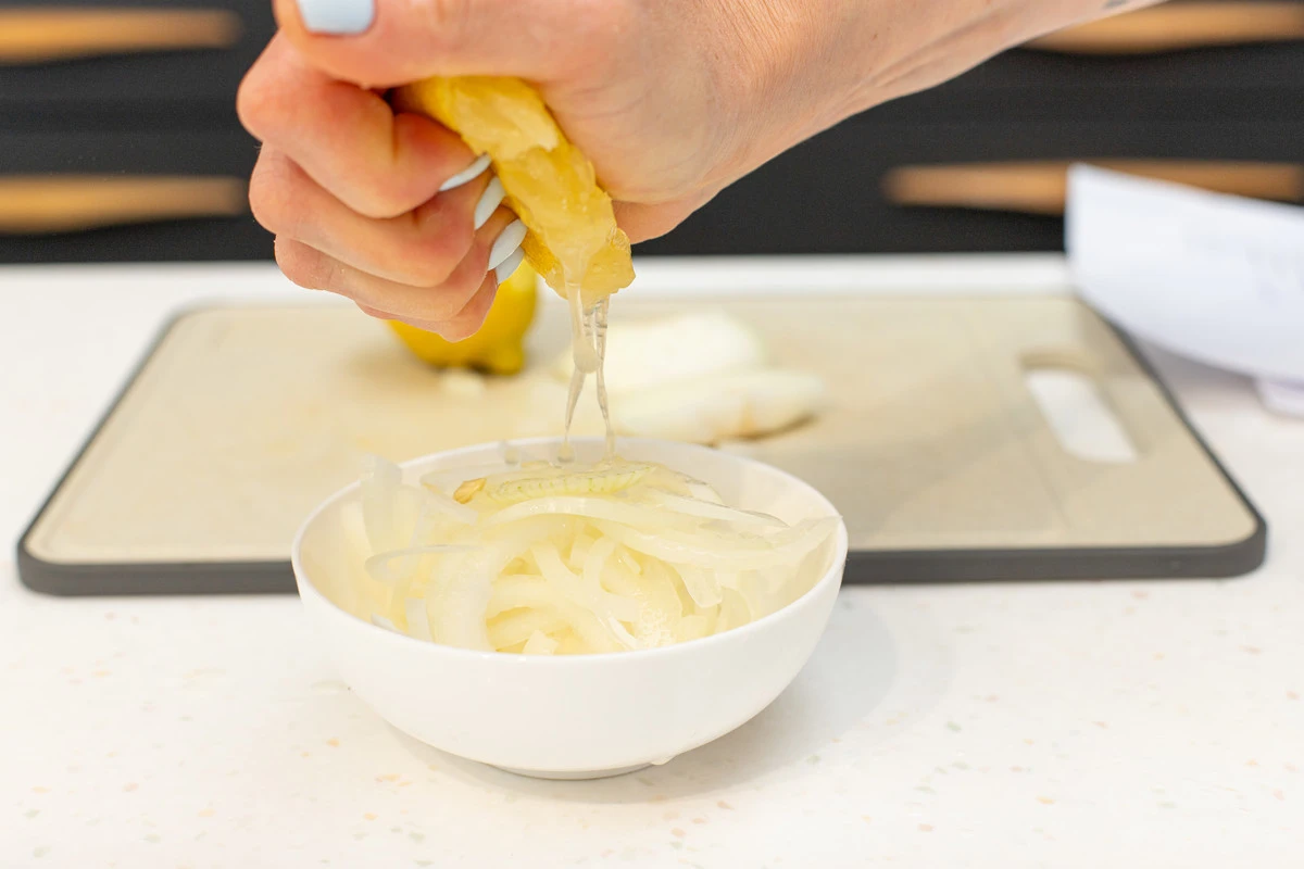 Оставшуюся луковицу очистите и нарежьте тонкими полукольцами. Выдавите сок из половинки лимона на лук, посолите и перемешайте. Оставьте лук мариноваться, пока варится суп.
