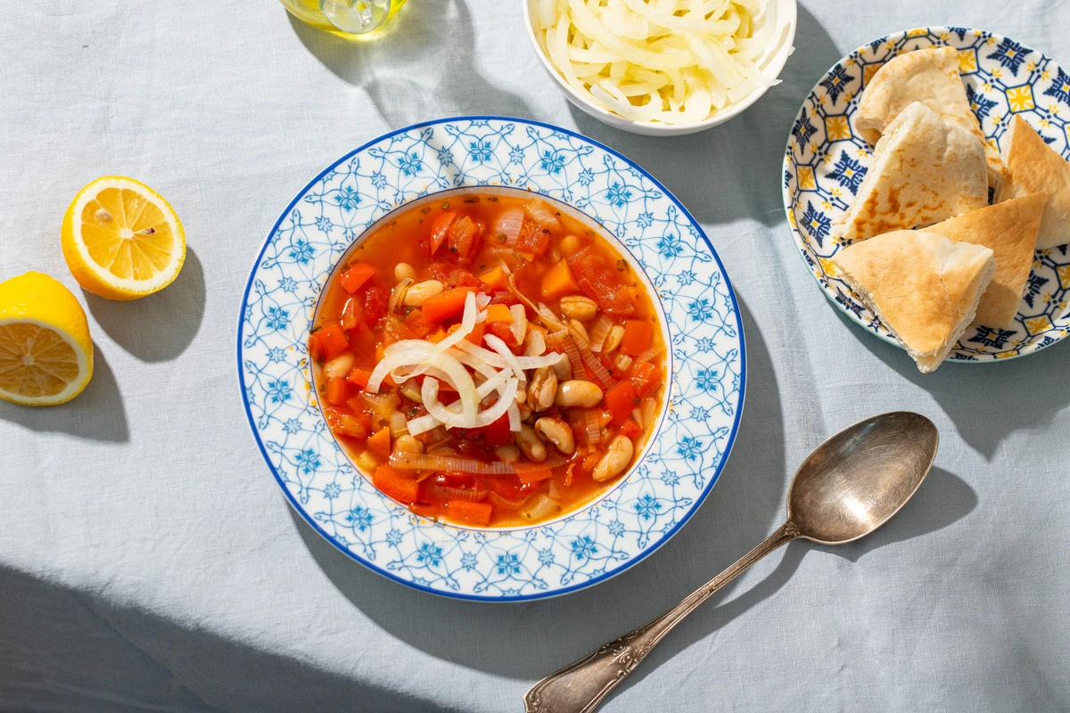 Фасолада — это густой, наваристый фасолевый суп. Не жалейте оливкового масла для правильного вкуса и обязательно приготовьте маринованный лук для подачи.
