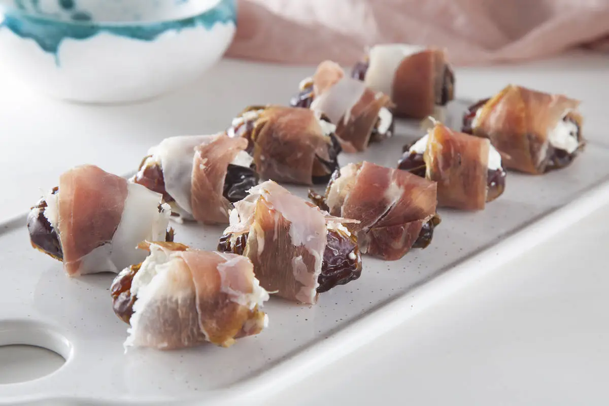 В каждый финик положите брынзу, оберните полоской шпека. Приятного аппетита!