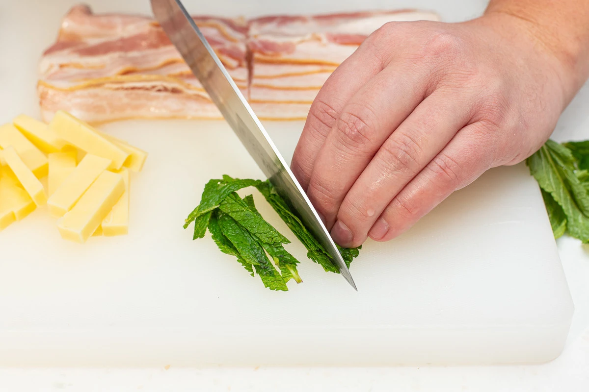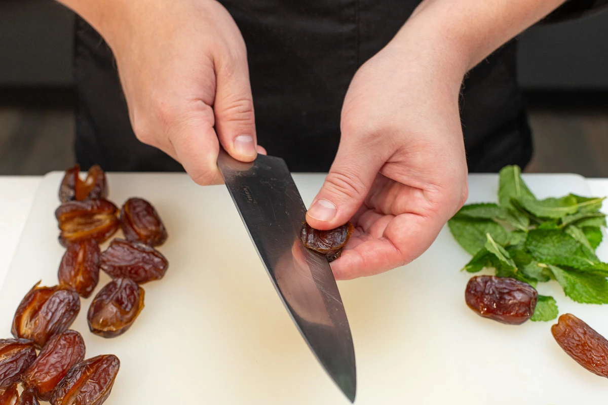 Нарежьте чеддер небольшими брусочками, которые будет удобно поместить внутрь фиников. Мяту мелко порубите.