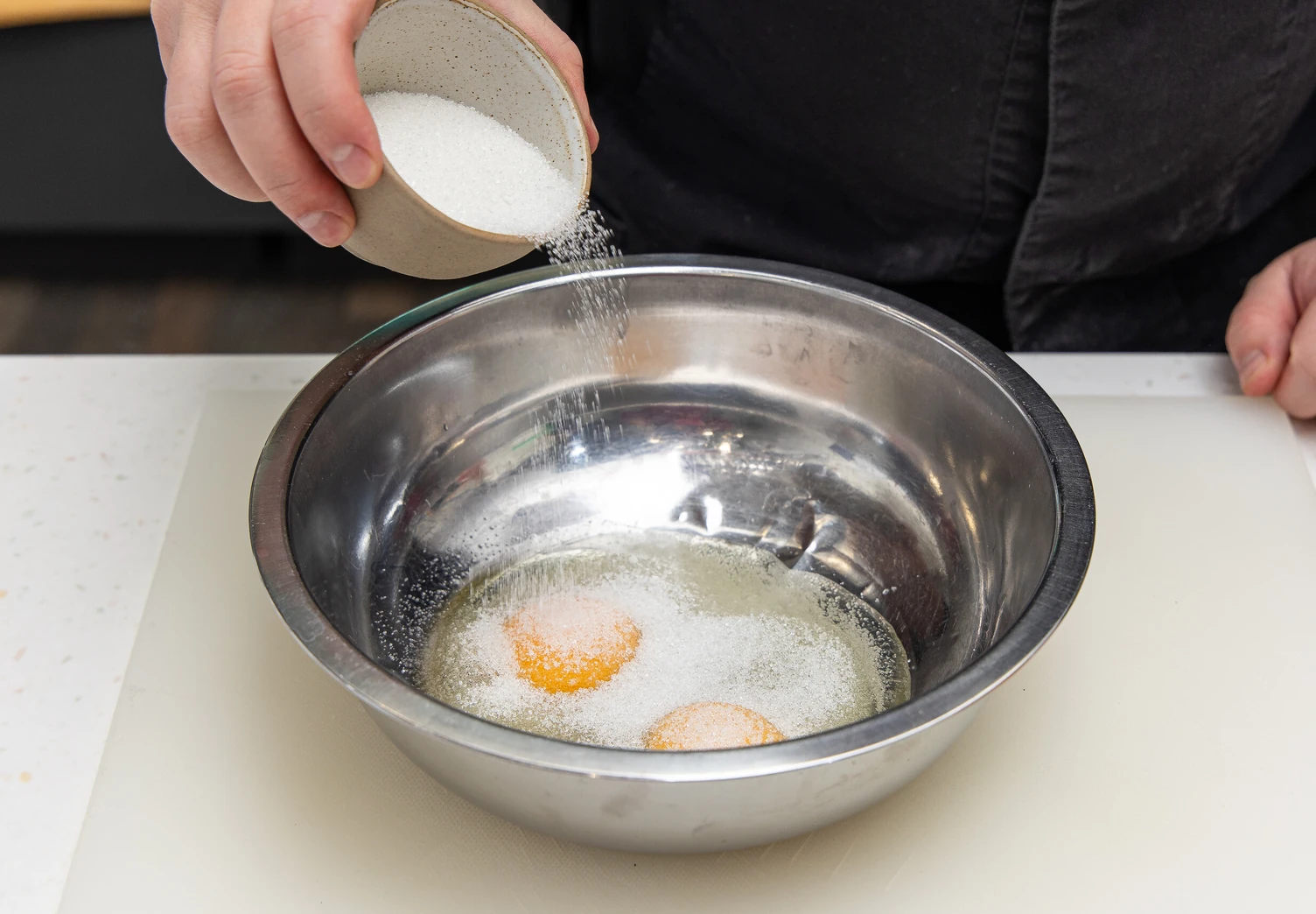Яйца с сахаром взбейте венчиком или миксером.