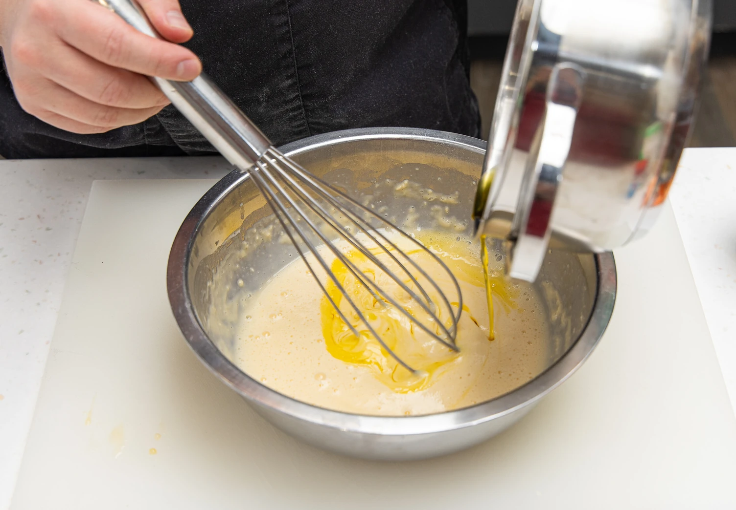 Муку просейте через сито и в конце добавьте разрыхлитель. Перемешайте тесто венчиком до однородности, влейте растопленное сливочное масло и снова перемешайте. Получится тесто на блины.