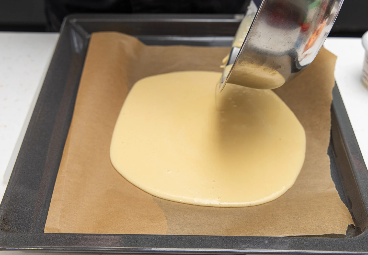 Вылейте его на противень, застеленный пергаментом, и равномерно распределите по поверхности. Отправьте в духовку, разогретую до 180°C, на 20 минут. Готовому блину дайте остыть.