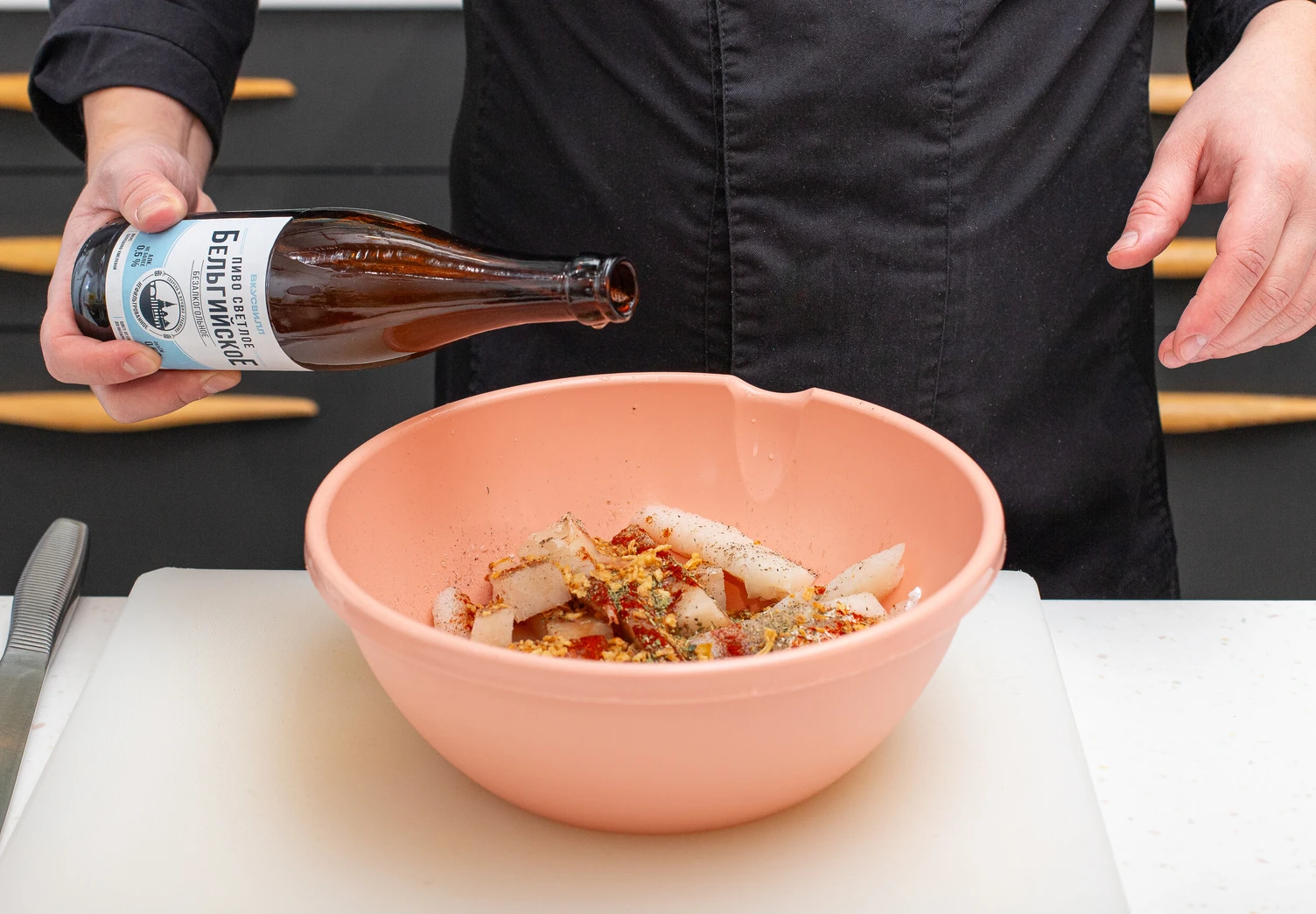 Разморозьте треску и порежьте на небольшие полоски шириной 3 см. Обваляйте рыбу в специях и соли, добавьте жареный лук и 100 мл пива. Оставьте мариноваться на 1 час при комнатной температуре.