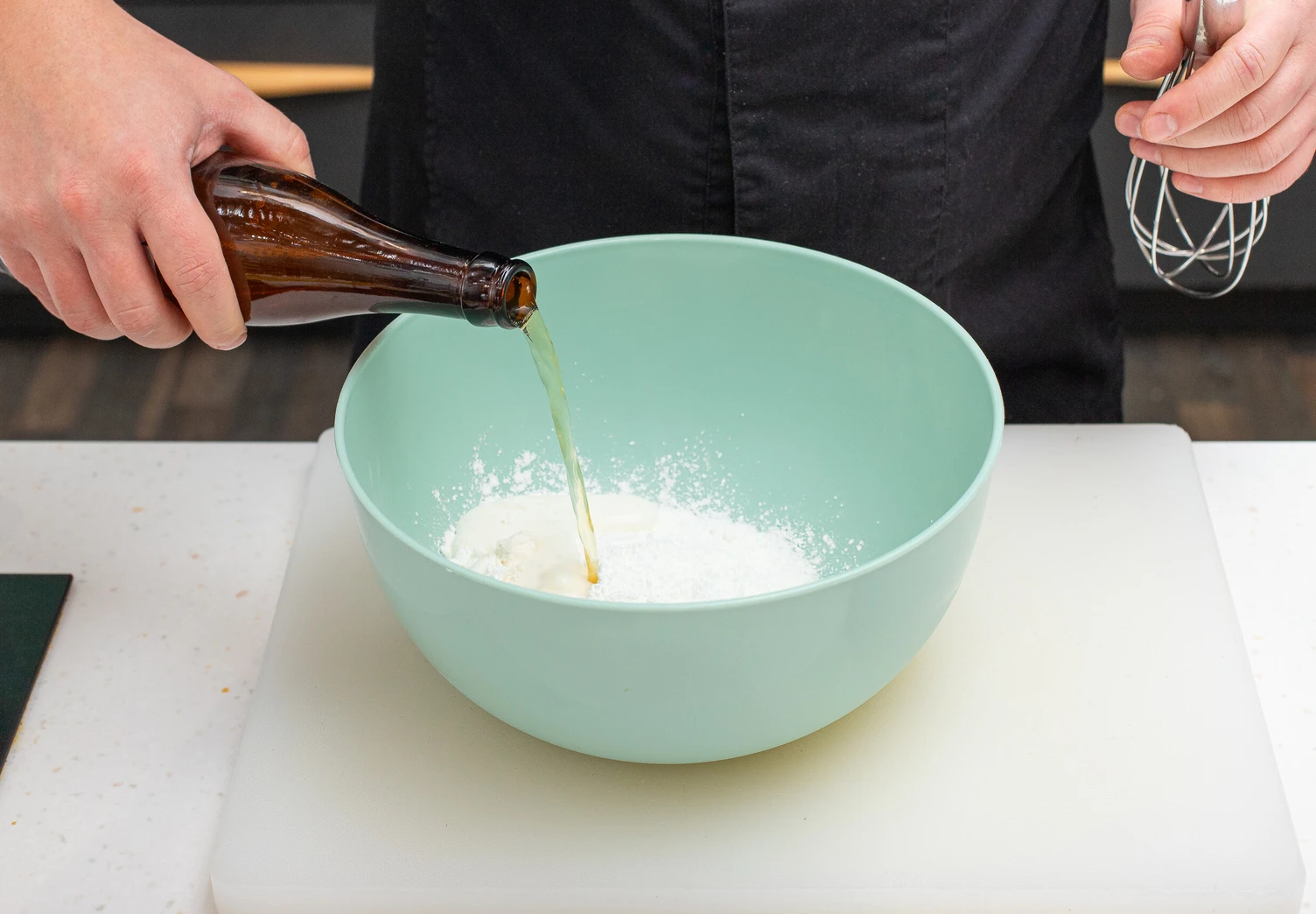 Приготовьте кляр, смешав оставшееся пиво, крахмал, муку и разрыхлитель.