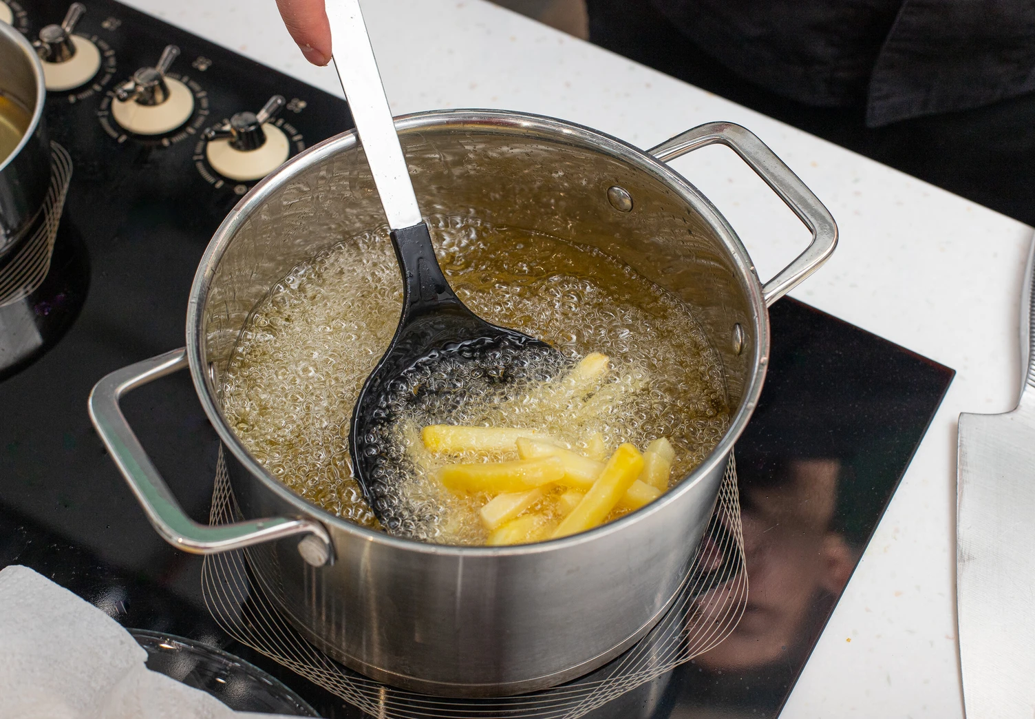 Разогрейте в глубокой сковороде масло и обжарьте в нём картофель фри до золотистой корочки.