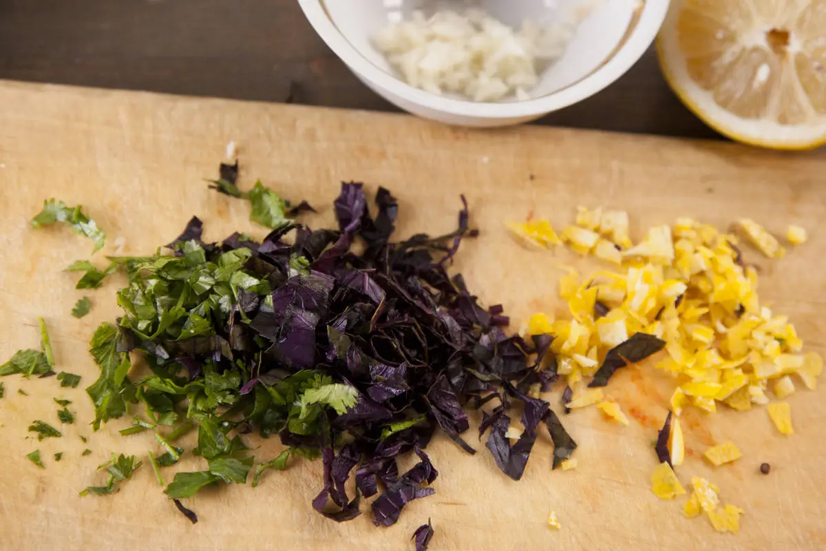Цедру, зелень и чеснок мелко порубите, смешайте с масляной смесью.