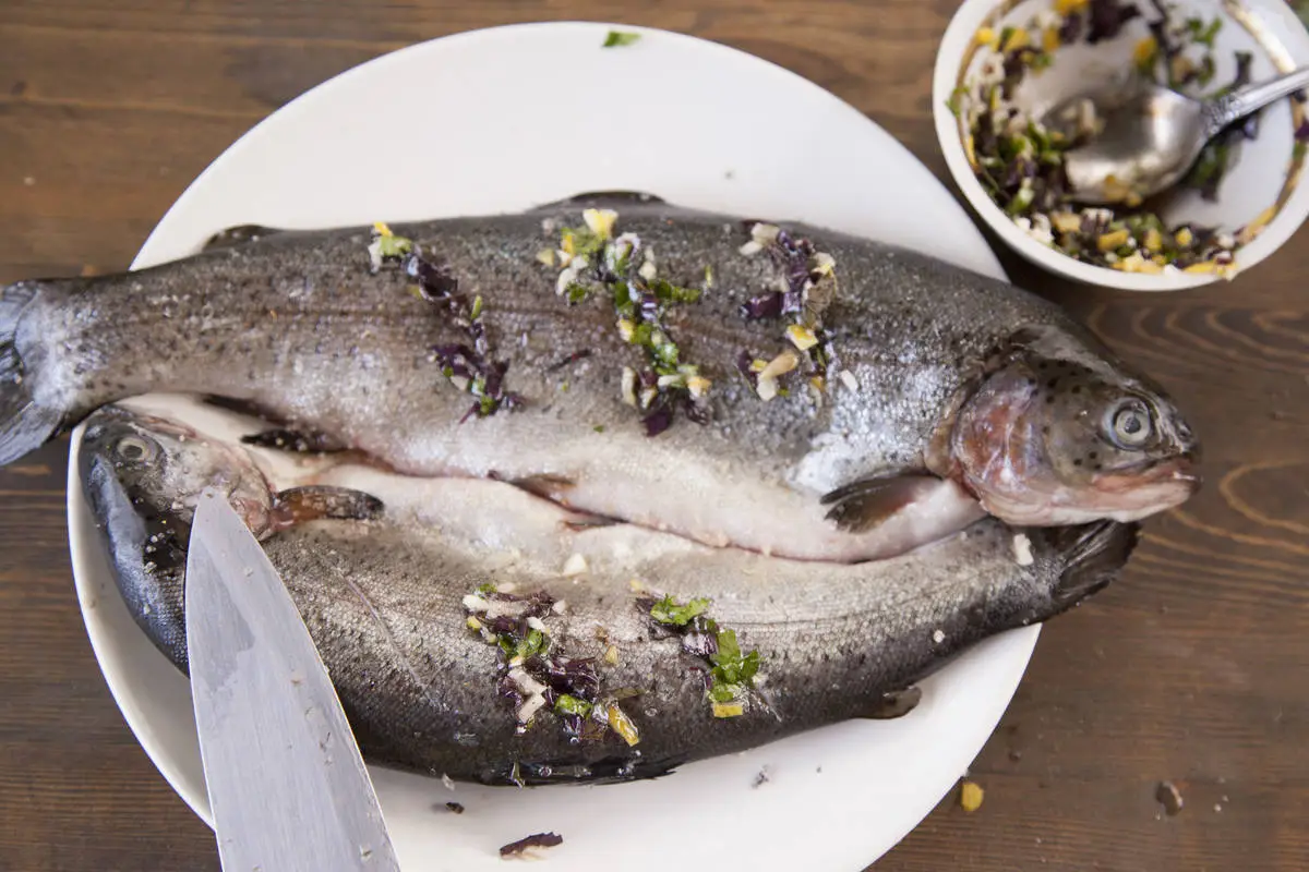 Начините брюшки и прорези получившейся смесью. Готовьте рыбу на решетке над не горячими углями. Подавайте сразу, с дольками лимона и зеленым салатом!