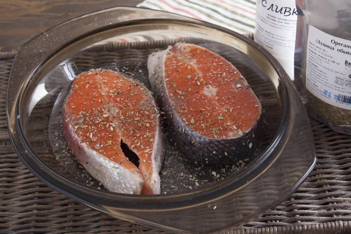 Предварительно размороженную форель обсушите, натрите солью и перцем.