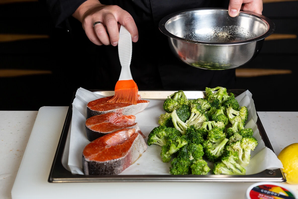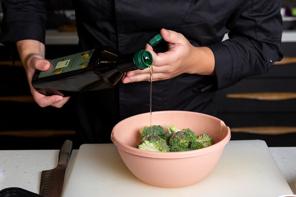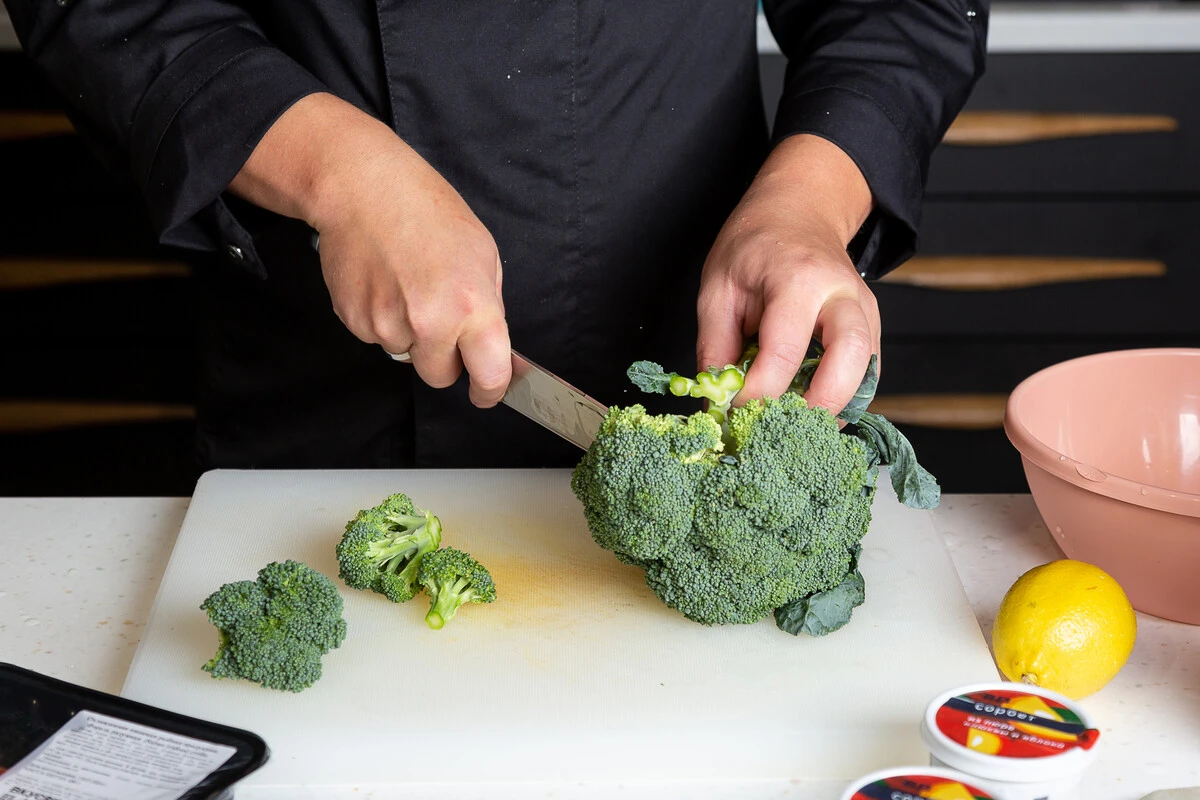 Если используете замороженные стейки форели, разморозьте их. Брокколи помойте, разберите на соцветия. Выложите в миску.