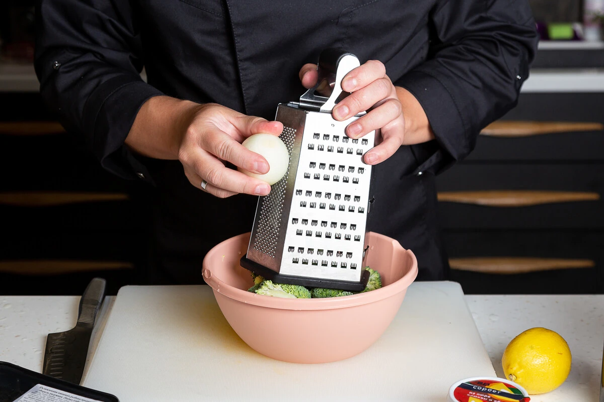 Лук натрите на мелкой тёрке добавьте к брокколи.
