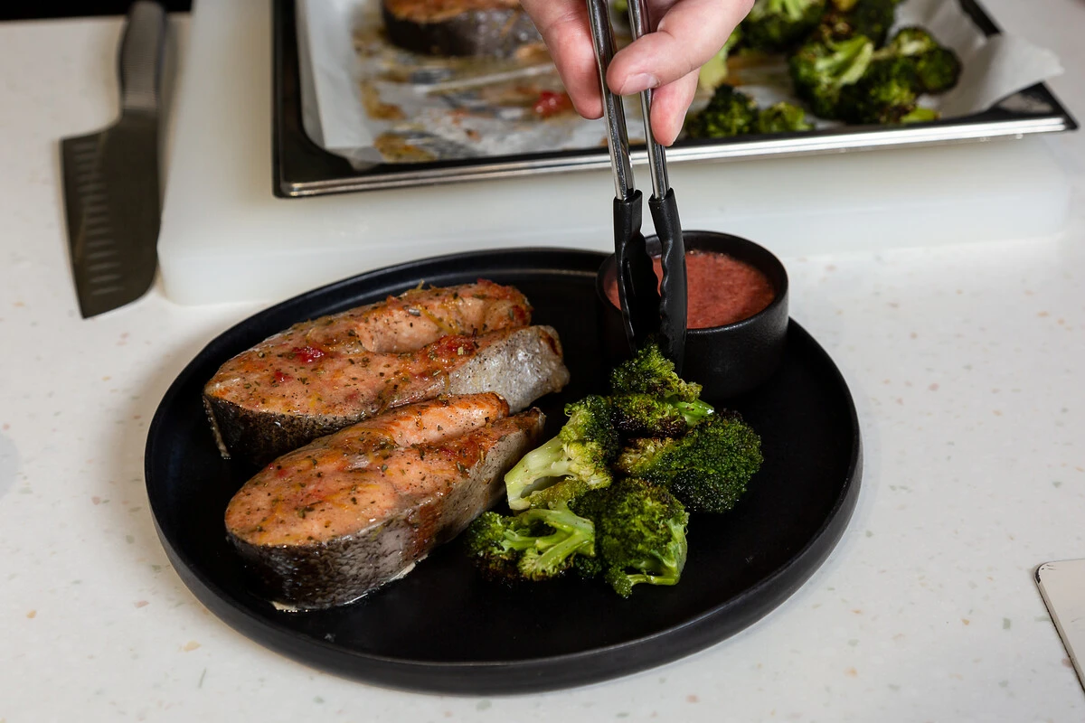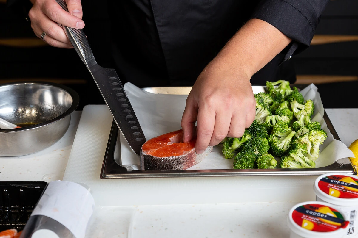 Форель, запечённая с брокколи с соусом из сорбета