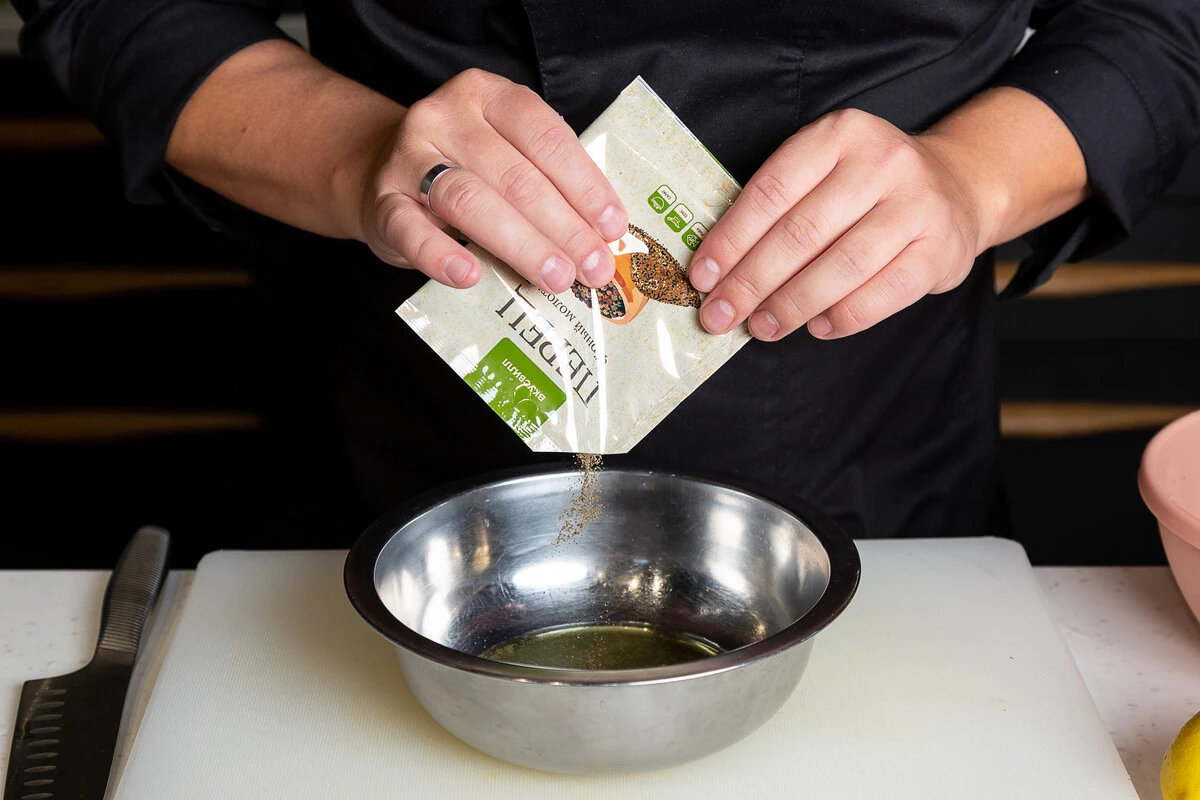 Насыпьте чёрный молотый перец, соль, оливковое масло, хорошо перемешайте.
