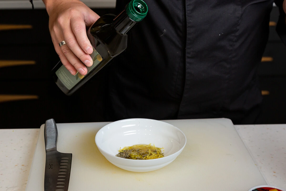 Сделайте масляный соус: в миску налейте 1 ст. л. оливкового масла, добавьте 2/3 ч. л. соли, 1/6 ч. л. молотого перца, перемешайте.