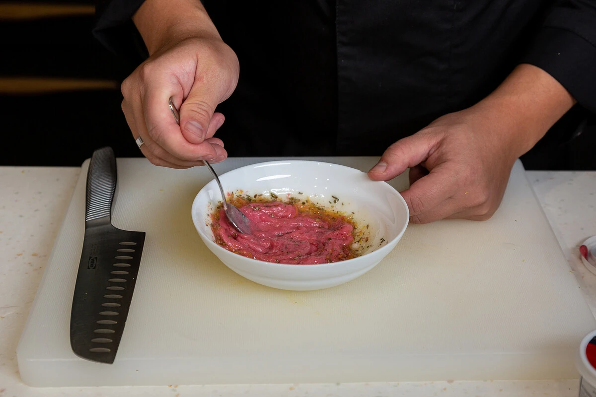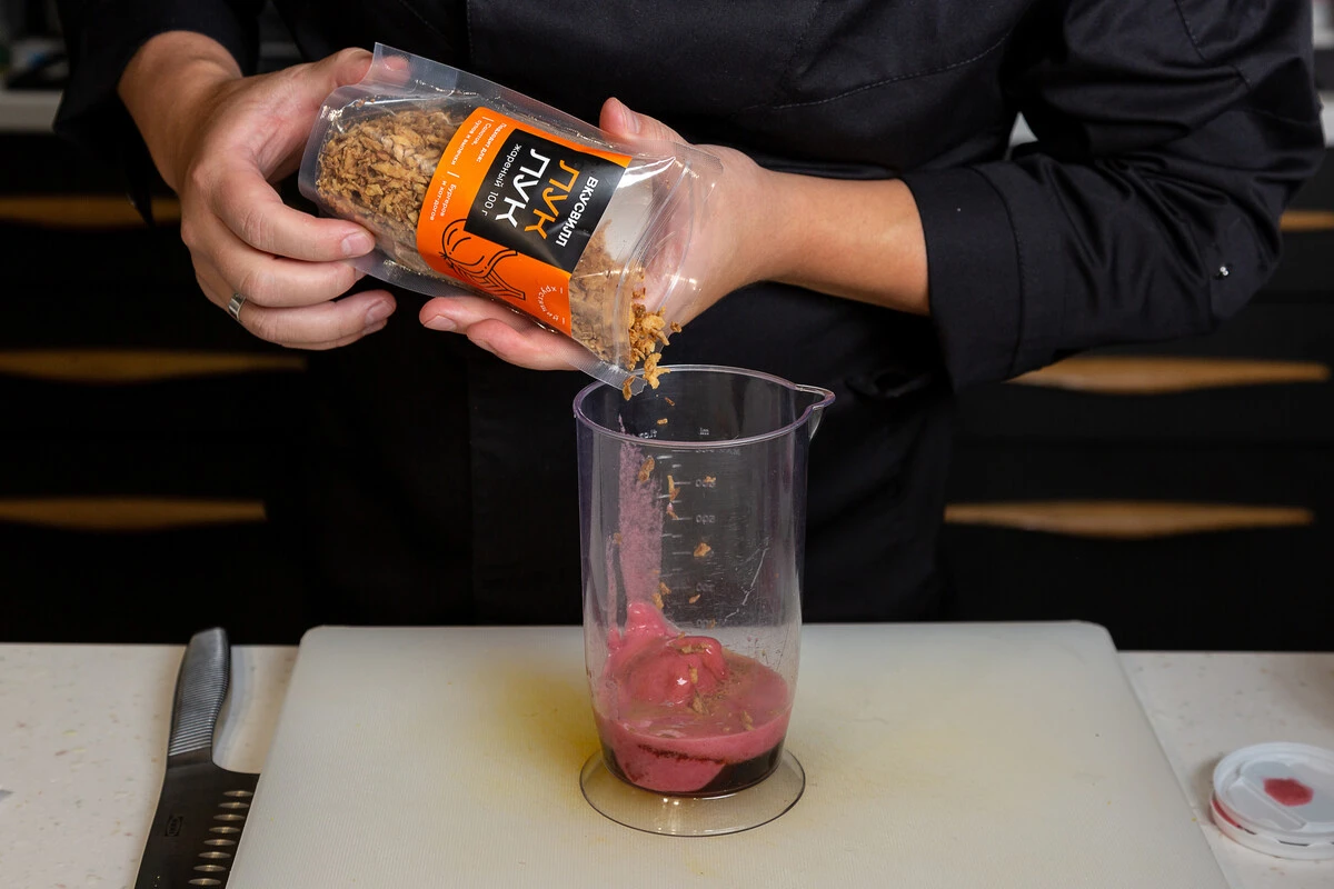 Сделайте соус. В стакан блендера выложите 125 г сорбета, добавьте жареный лук, соевый соус и смешайте всё вместе блендером.