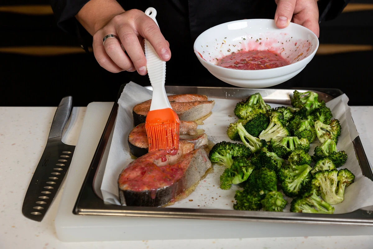 Смажьте запечённую рыбу глазурью на основе сорбета и запекайте ещё 4-5 минут при 180 ℃.