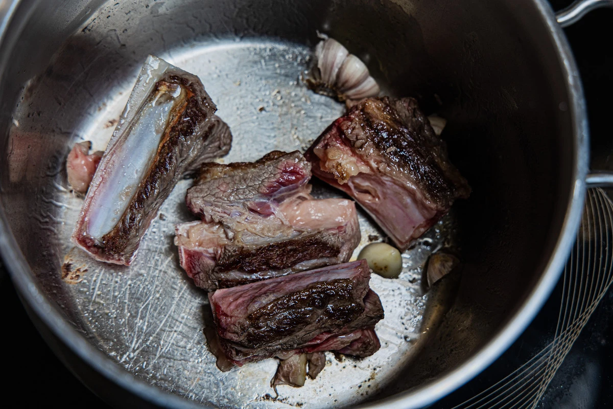 Говяжьи рёбра сложите в кастрюлю с толстым дном, добавьте разрезанные пополам зубчики чеснока, немного оливкового масла и обжарьте до золотистости.