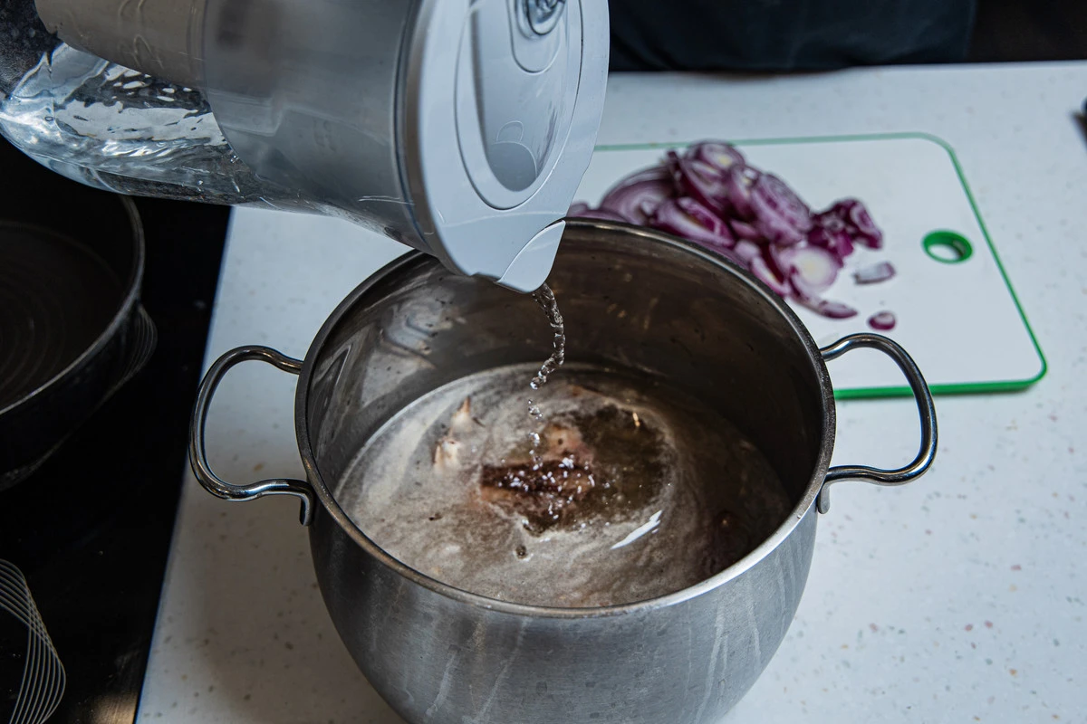 Залейте водой, посолите, доведите до кипения, убавьте огонь и варите до готовности (около часа). Бульон должен увариться примерно до 900 мл.
