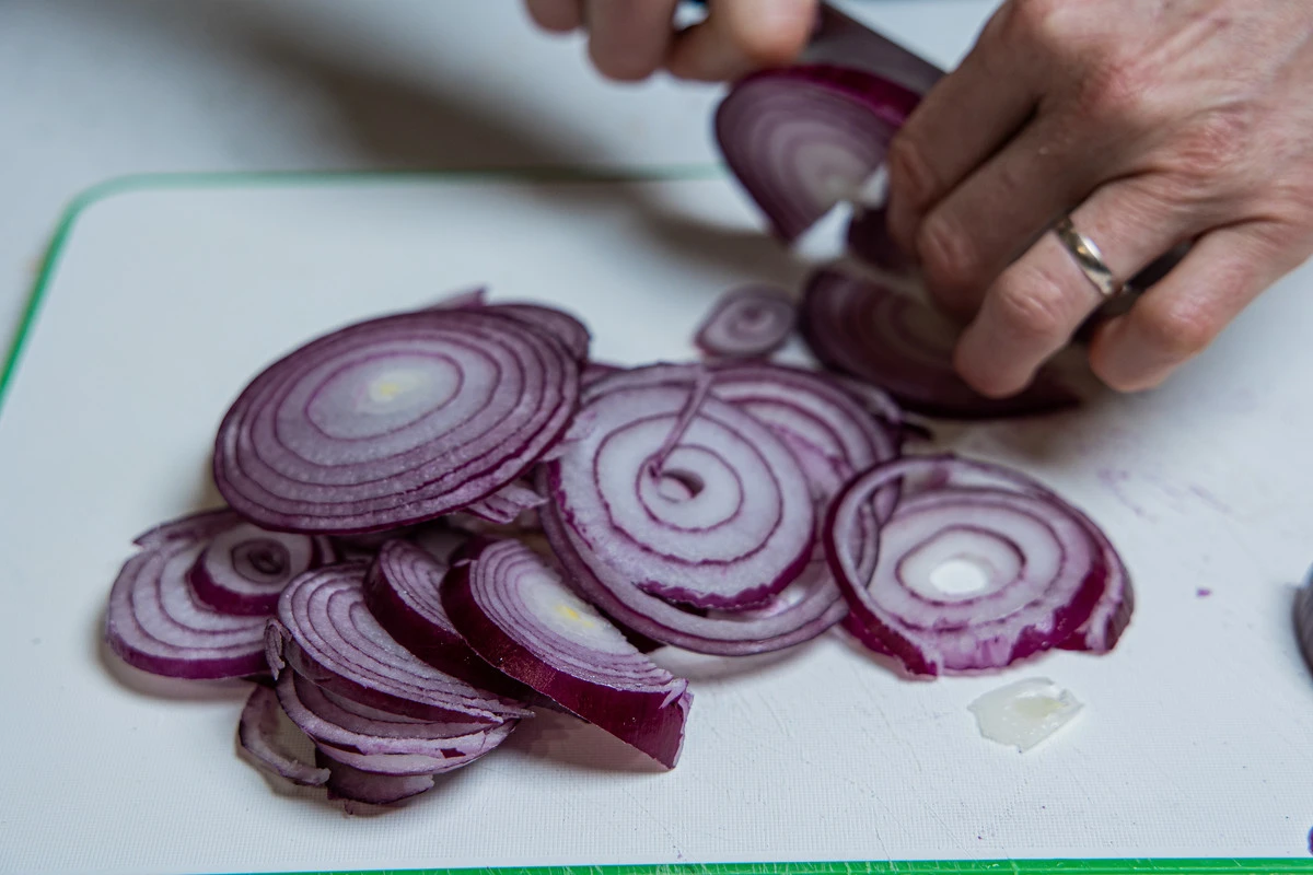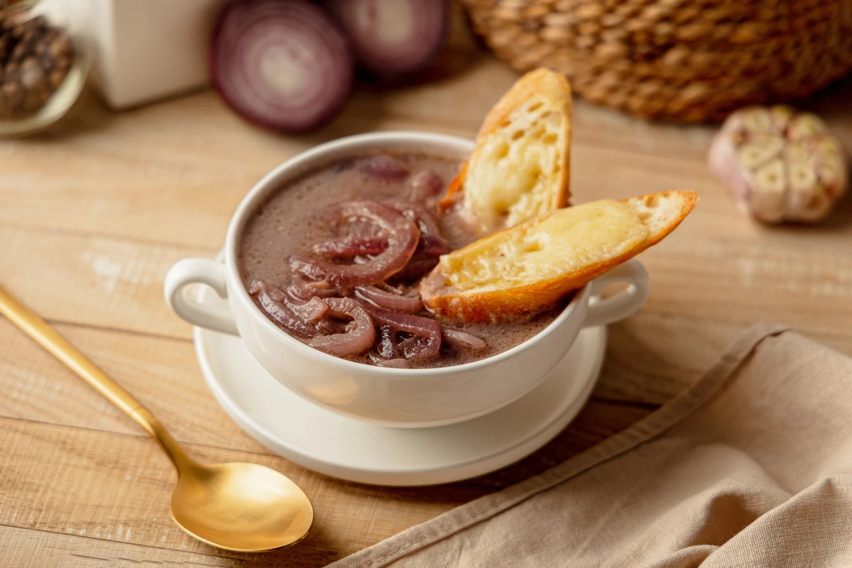 Один из вариантов французского лукового супа — на красном вине и мясном бульоне, с красным луком. Ароматный суп для любителей всего лукового.